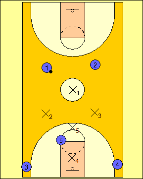 X3 pointing the ball, X1 on top, X5 covering the high post, X4