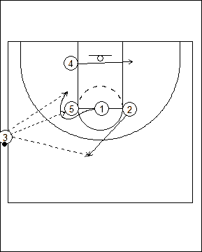 From a 1-4 high look, a pinch post entry into screen-the-screener action involving #2 screening for #5 and #4 screening for #2.