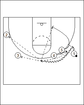 #5 sets a down screen for #4 who then comes out to set a