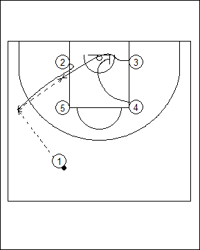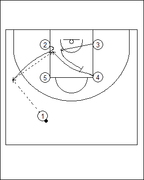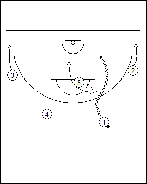 Once #1 passes to #2, #5 sets the ball screen and #4 spots