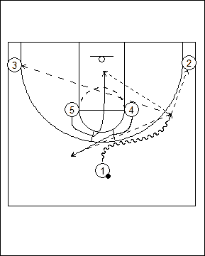 #4 sets a ball screen for #1 and rolls to the basket. #1 continues and receives a ball screen from #5 who will also roll.