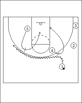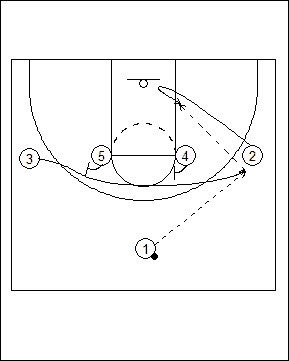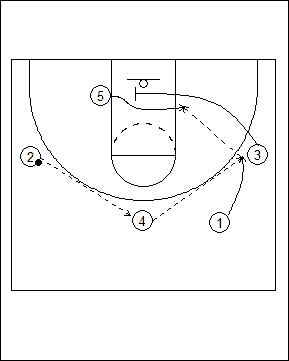 Off of secondary break, #2 swings to #4 who then swings to #1. #3 breaks from the wing and sets a screen to bring #5 to the ball-side low block.
