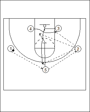 screens for #4. #3 comes off of a down screen set by #5. |