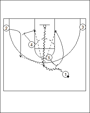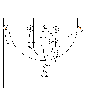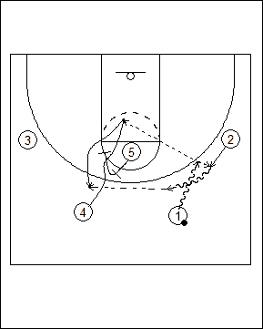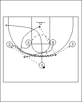 back screen for #4 by #5. A dribble handoff by #1 and #2 is