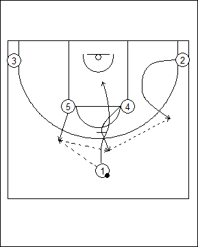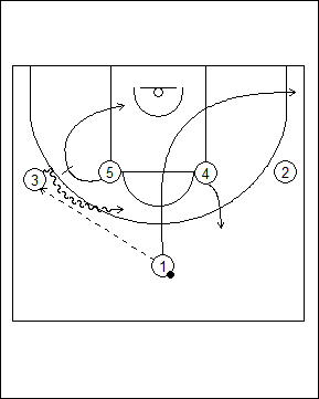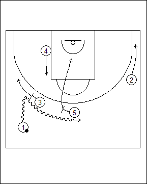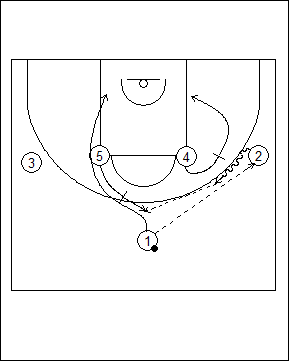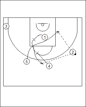 #2 passes the ball to #5, #3 will set a down screen for #1.