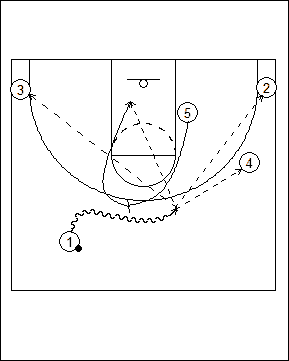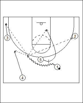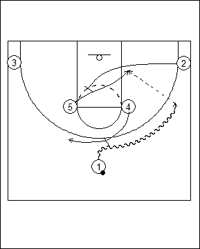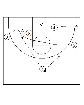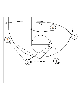 End of half play off inbounds following a made basket. #5 sets an open post pick and roll for #1.
