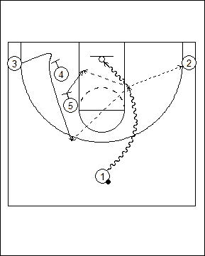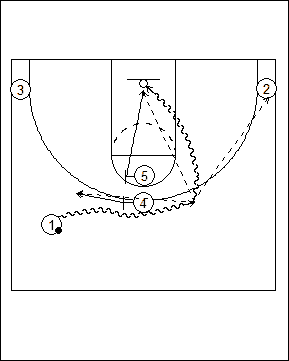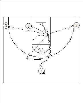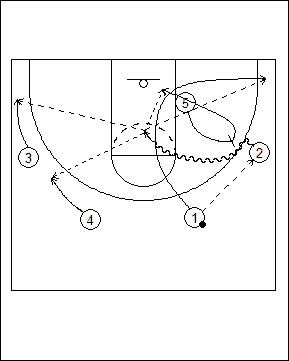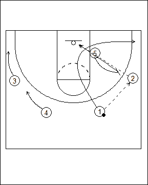 ball screen offense from a 2-2-1 set. Here, #1 passes and