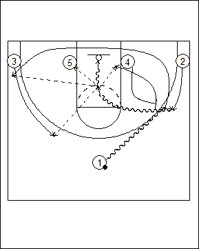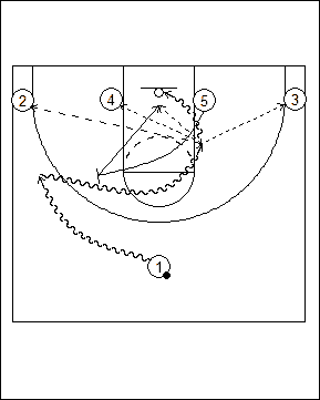 A rear pick-and-roll set by #5 for #1. #3 and #4 switch
